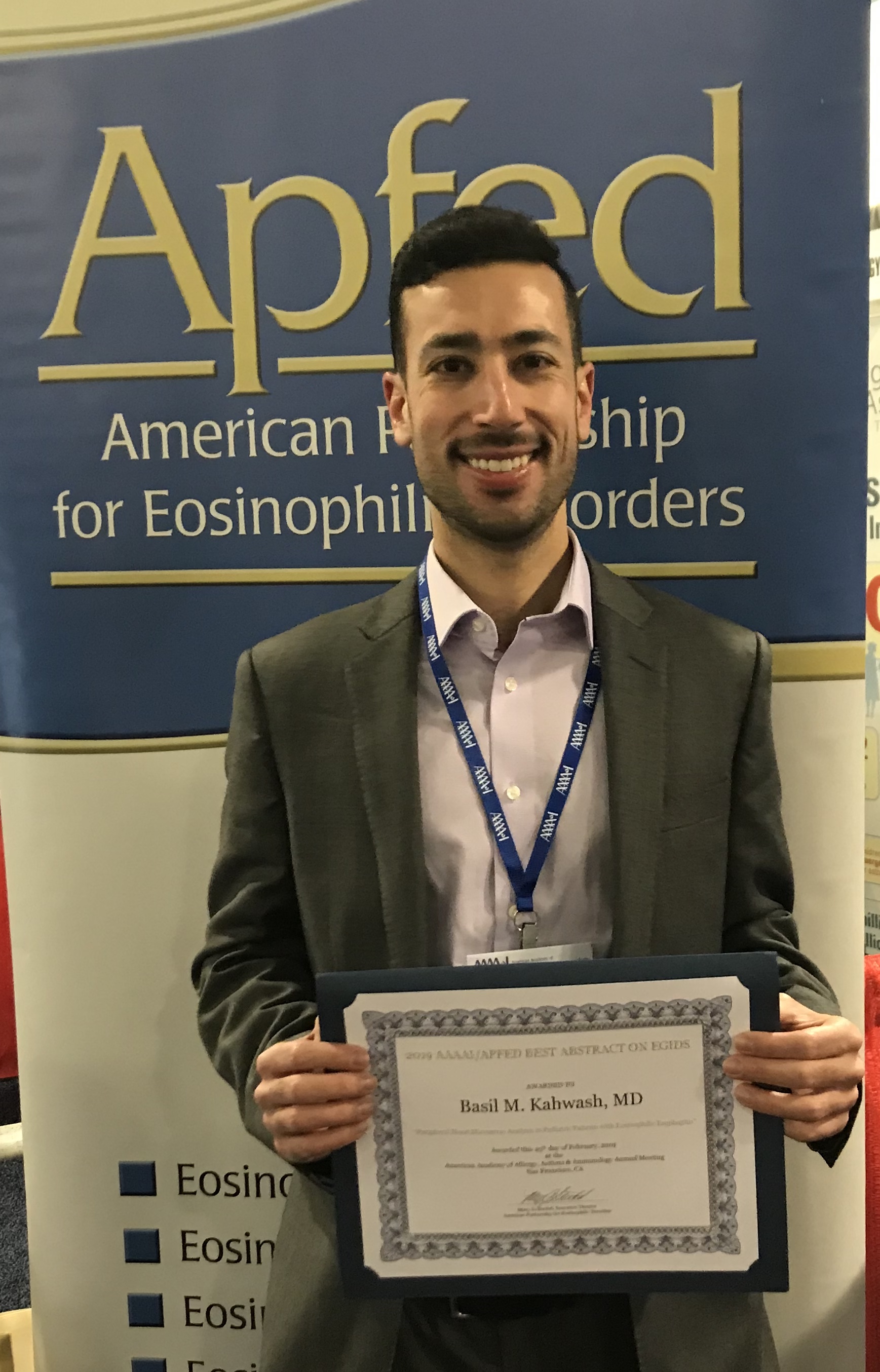 The 2019 AAAAI/APFED Best Abstracts on EGIDs recipients are Basil M. Kahwash, MD (Fellow-in-Training), The Ohio State University, Columbus, Ohio, for his abstract entitled “Peripheral Blood Microarray Analysis in Pediatric Patients with Eosinophilic Esophagitis,” and Catherine Sonaly Ferreira Martins, MD (Member), Division of Clinical Immunology and Allergy, Hospital das Clínicas, University of Sao Paulo, Sao Paulo, Brazil, for her abstract entitled “EoE, OIT and Anaphylaxis: an unsolved puzzle.”