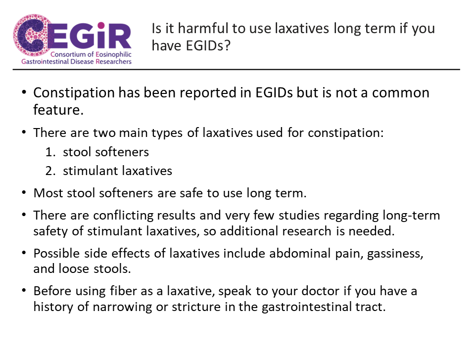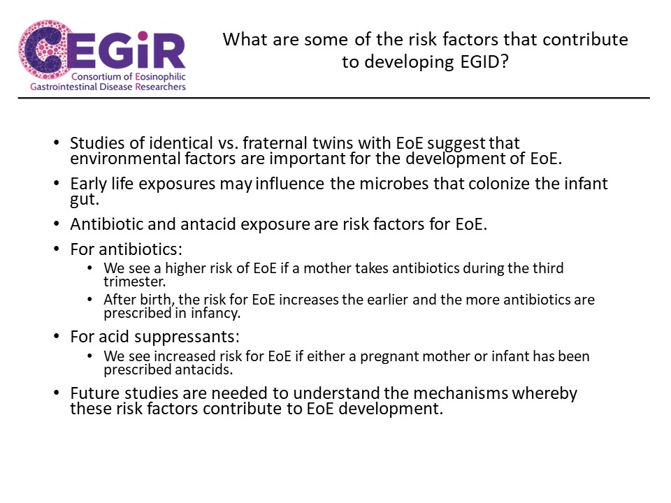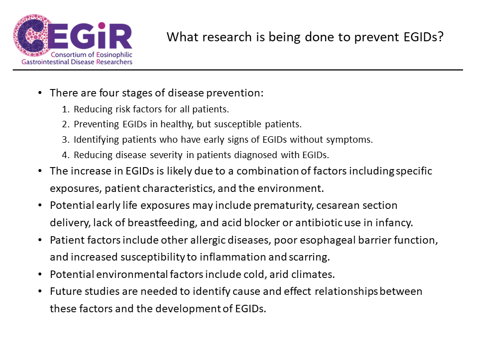 - This collaborative consortium will include long-term study and follow-up of patients with EoE, EG, and EC to help researchers understand the natural history of these diseases, which treatments work for which diseases, and more. Additional pilot and clinical trials will also help scientists learn more about how to diagnose and treat these different EGIDs. Patient participation and feedback is critical to the success of these research projects.